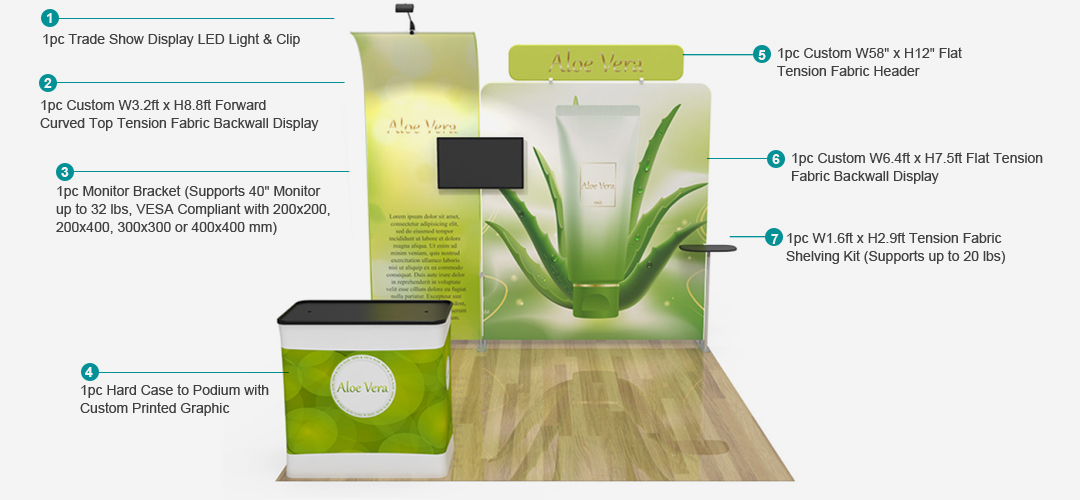 Featuring a blend of two flat tension fabric backwall displays, two angled tension fabric backwall displays, a brochure and literature banner stand, a television monitor display bracket, a podium (with included carrying case), four tube columns, eight hangers and four LED light fixtures, this unique booth has the ability to engage any audience.
