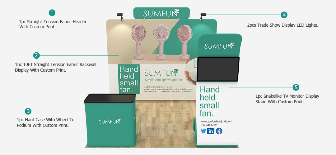 Featuring a blend of a flat tension fabric backwall display, a flat tension fabric header, a tension fabric television banner stand, a podium (with included carrying case) and a duo of LED light fixtures, this unique booth has the ability to engage any audience.