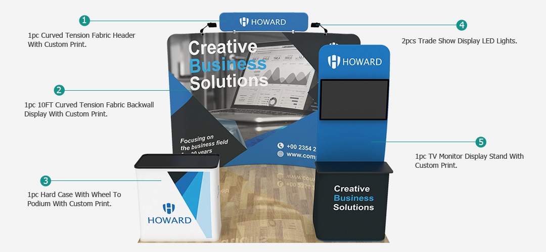 Featuring a curved and collapsible tension fabric backwall display, a curved tension fabric header, a television display table banner stand, a podium (with included carrying case), and a duo of LED light fixtures, this unique booth has the ability to engage any audience.