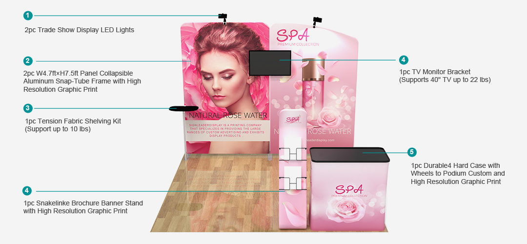 Featuring a blend of flat and angled backwall displays, a literature and brochure stand, a fabric shelf, a podium (with included carrying case), a television monitor bracket, and a duo of LED light fixtures, this unique booth has the ability to engage any audience.