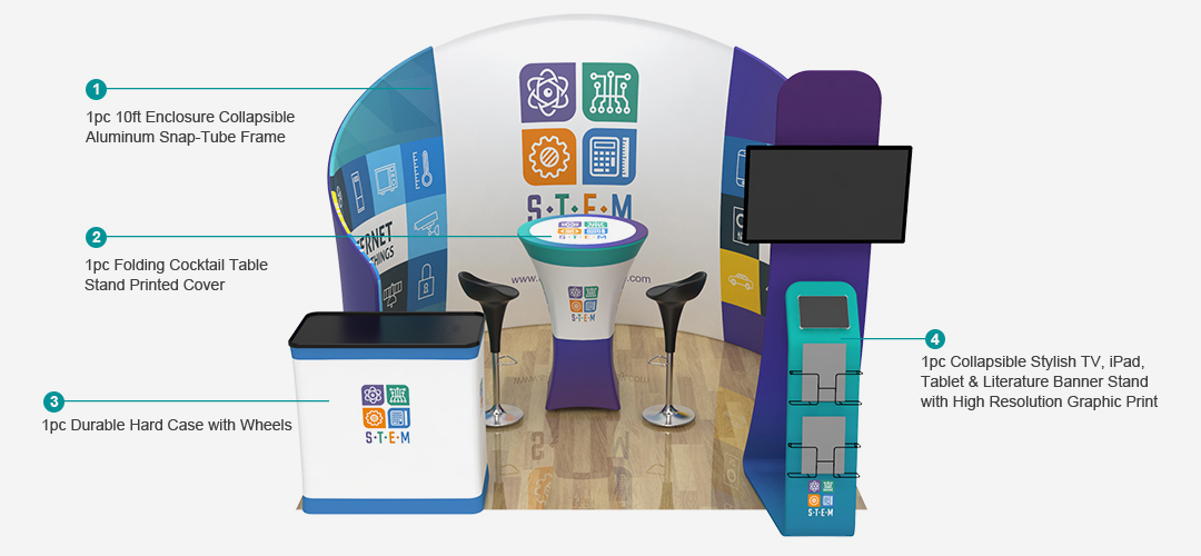 - Set includes curved backwall, podium, standing table, ipad stand and more