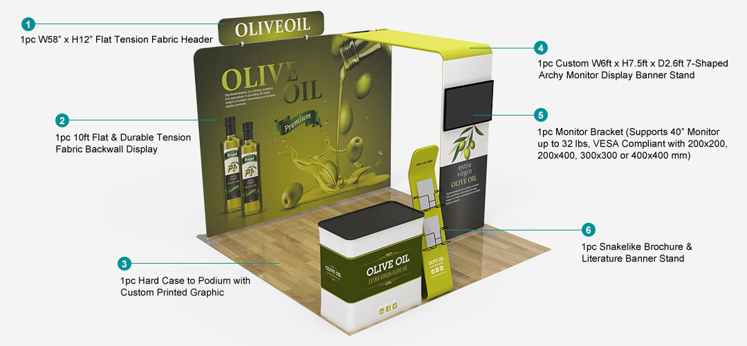 Featuring a flat tension fabric backwall display, a tension fabric header, a literature and brochure stand, a television monitor bracket and display stand, and a podium (with included carrying case), this unique booth has the ability to engage any audience.