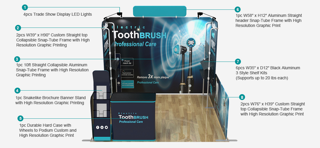 Featuring a blend of five flat tension fabric backwall displays, a flat tension fabric header, a brochure and literature banner stand, a television display table banner stand, a podium (with included carrying case), four tube column, six hangers, and four LED light fixtures, this unique booth has the ability to engage any audience.