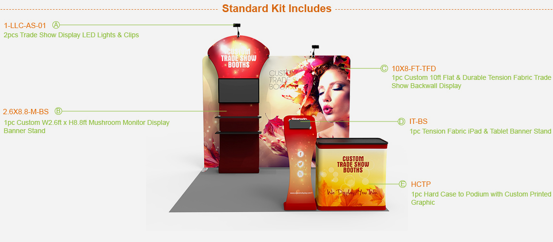 Featuring two flat tension fabric backwall displays, a literature and brochure stand, a podium (with included carrying case), a "shoe-rack" style shelf, a television monitor bracket, and a duo of LED light fixtures, this unique booth has the ability to engage any audience.
