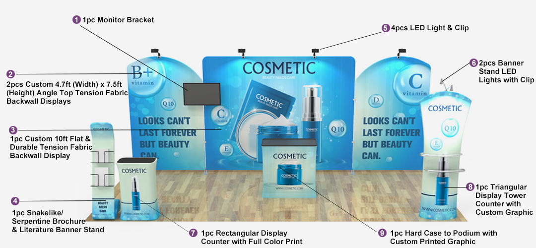 • Set includes backwalls, podiums, literature/shelving stands and more