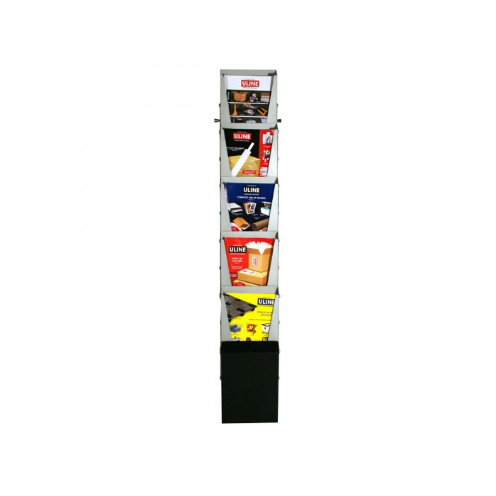 This stylish 5-Step Literature Rack holds literature even while folded, making portability even easier. Pockets holds 8 1/2" x 11" literature; 1 1/2" deep. Set up is simple: pull pegs on sides of rack, lift up to extend rack, and click pegs back into place. Displayed height: 56" Dimensions when collapsed: 9" width x 11 1/2" length x 13" height Utilizes floor space of 9" x 11 1/2" Comes with a convenient padded carry bag. Weight 10 lbs.